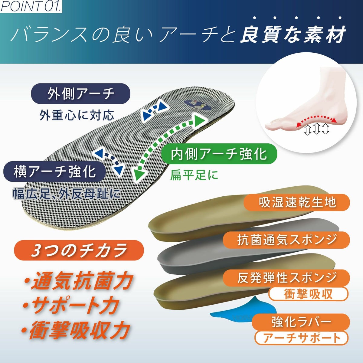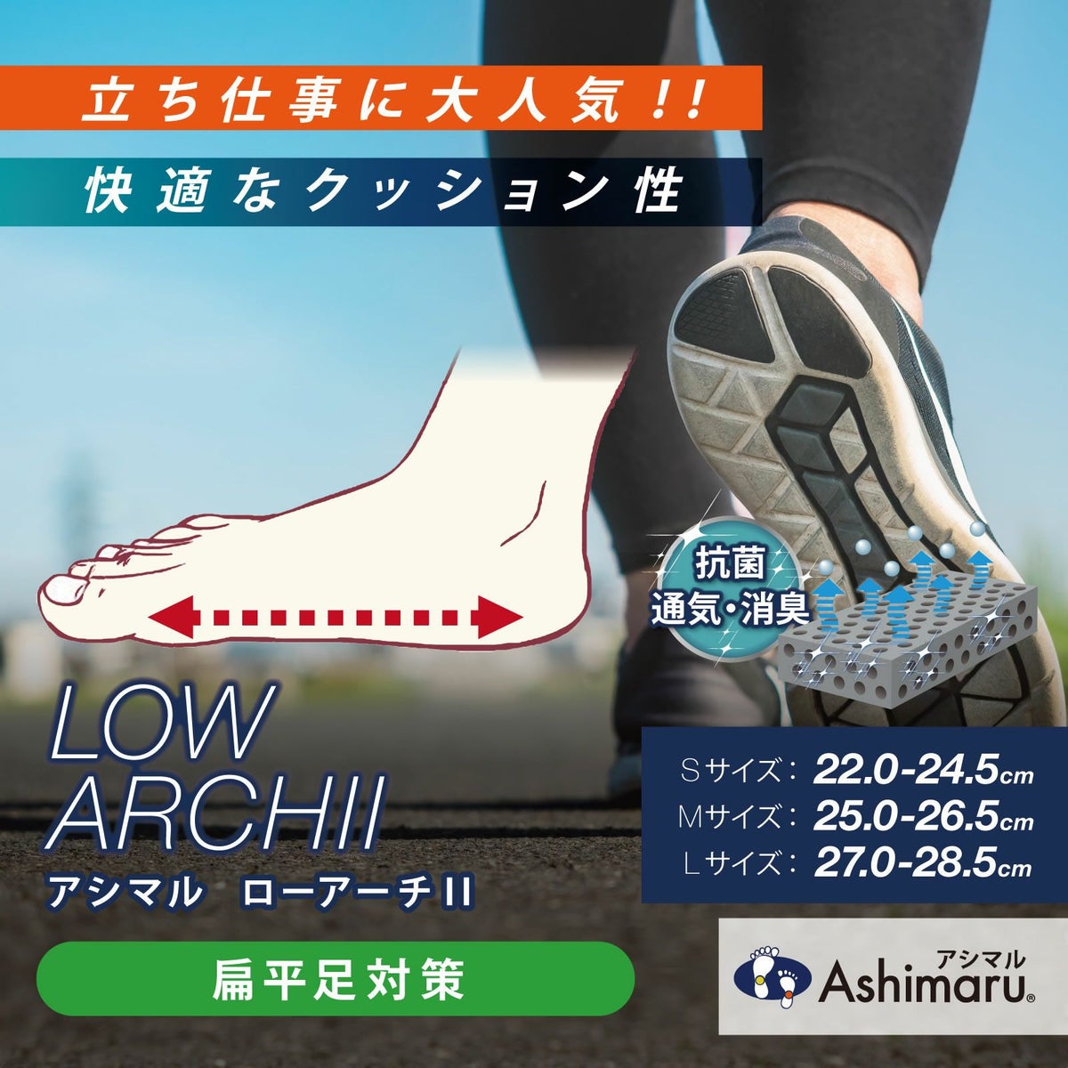 標準的なアーチを保つことで、足膝腰の負担を軽減します