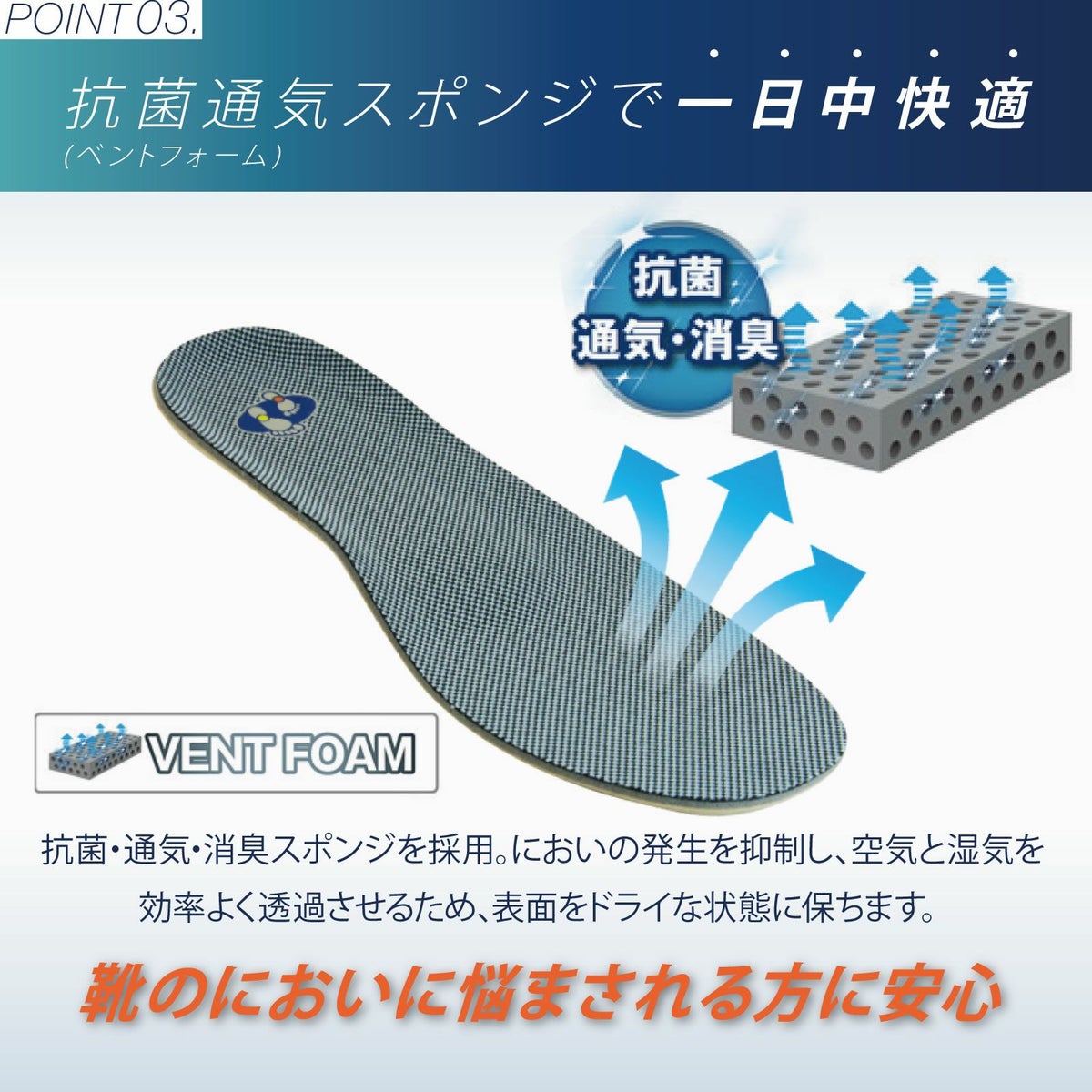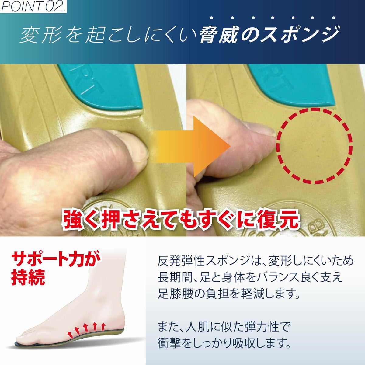 標準的なアーチをキープできる扁平足に対応したインソールです。アーチサポートだけでなく、カカトが安定することで、足だけでなく身体のバランスも整えます。人肌に似た弾力スポンジで快適なクッション性とサポート力をを実現。立ち仕事、安全靴での労働、ウォーキングなどに。