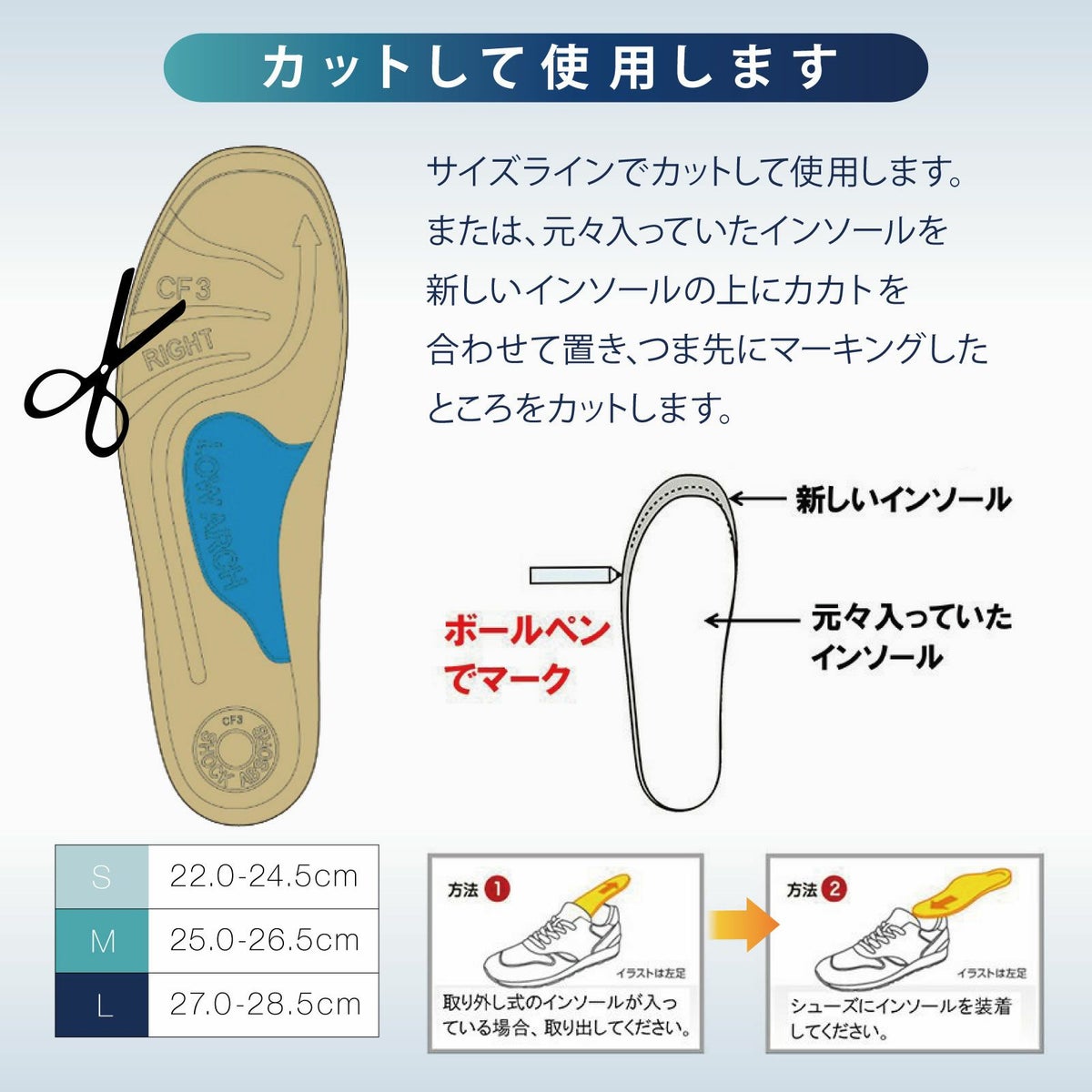 ※シンタイプ、スペースフィット、キッズインソールの3種は薄いため、上から入れるだけで装着できます。 -