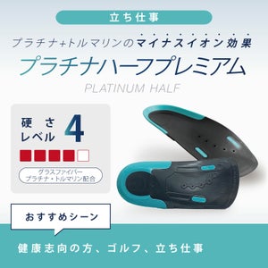 長時間の立ち仕事、ゴルフにおすすめ。グラスファイバーの反発力でアーチをしっかりサポート。プラチナ+トルマリン配合で血行サポートにつながります。