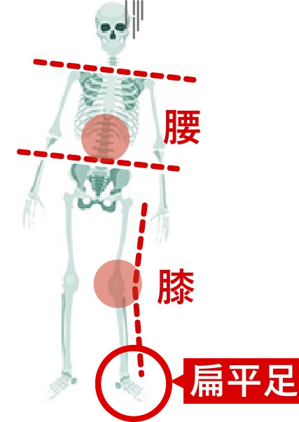 足のアーチが崩れることで、身体のバランスや歩き方のバランスが崩れます。そのことで、筋肉の負担が増え、足(カカト)、膝、腰の負担も増えていきます。