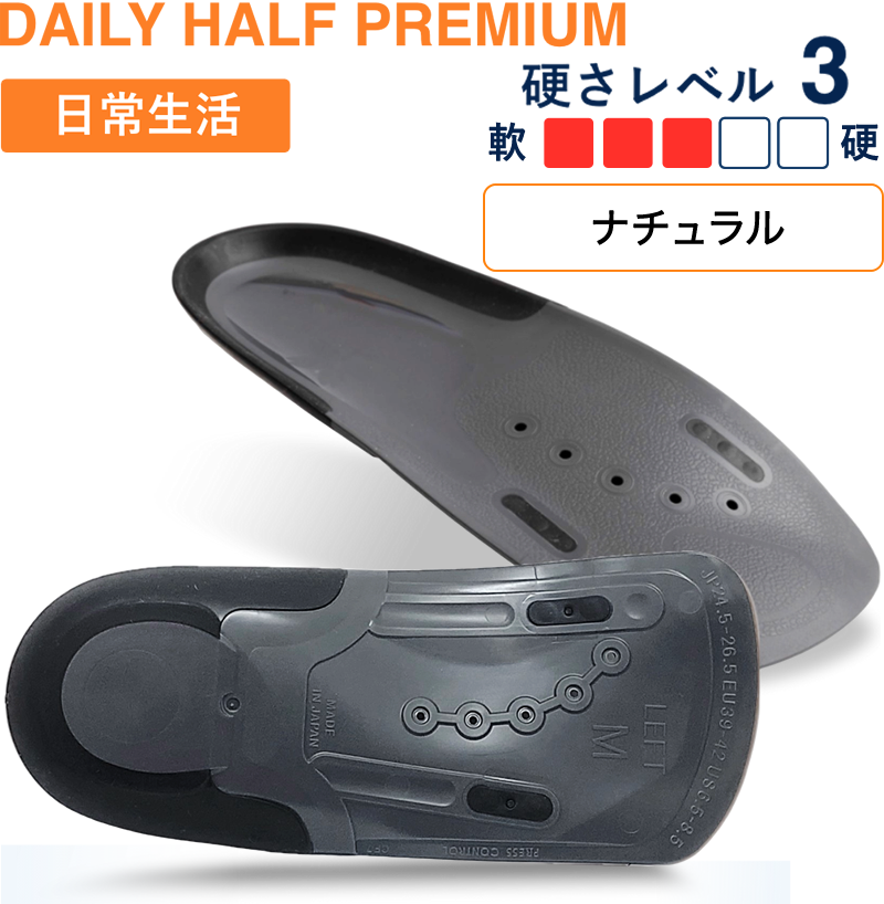 「DAILY HALF PREMIUM」は少し軟らかめで日常のシーンに。通勤やショッピングモールでの買い物、シニアの方にもおすすめ。革靴やローファーにはこちらがおすすめです。アーチをしっかり支えたい方は、その他のインソールをお選びください。
